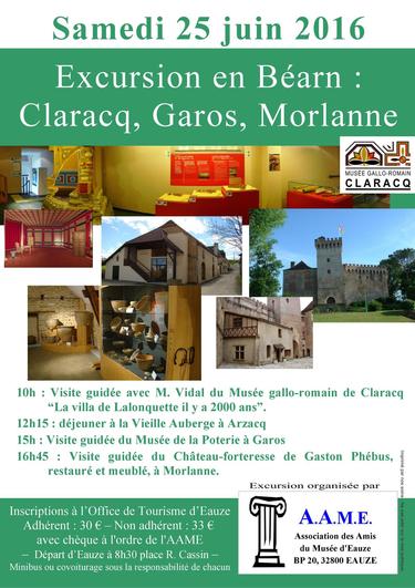 Accueil > Toutes les animations > Ateliers pédagogiques pour le grand public Excursion en Béarn 25 Juin 2016 L'Association des Amis du Musée d'Eauze vous propose une sortie culturelle en Béarn. Partez à la découverte du Musée Gallo Romain de Claracq, du Musée de la poterie à Garos et le château-forteresse de Gaston Phoebus à Morlanne. Adhérent : 30 € – Non adhérent : 33 € avec chèque à l'ordre de l'AAME Départ d’Eauze à 8h30 place R. Cassin Minibus ou covoiturage sous la responsabilité de chacun Inscriptions à l’Office de Tourisme d’Eauze : 05 62 09 85 62 145926affiche-claracq-2016.pdf