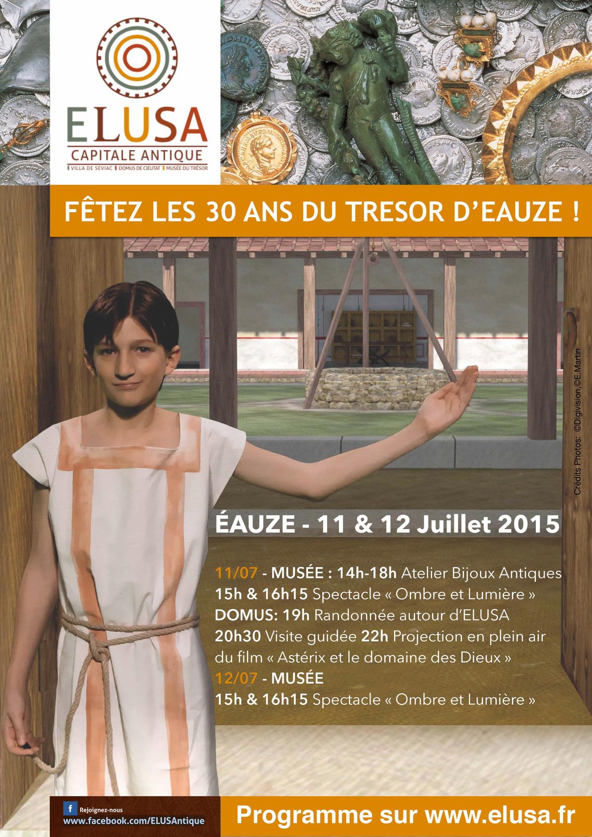 Accueil > Toutes les animations > Événements Le Trésor d'Eauze souffle ses 30 bougies ! 11 Juil 2015 au 12 Juil 2015 ANNIVERSAIRE DE LA DECOUVERTE DU TRESOR D'EAUZE ANIMATIONS Dans le cadre de l’anniversaire de la découverte du trésor et de l’ouverture du musée archéologique d’Eauze, ELUSA vous propose de venir participer aux animations suivantes : * Samedi 11 juillet : DOMUS DE CIEUTAT 19h / Randonnée sur les traces de la cité antique d’Elusa avec Pierre Pisani (responsable des fouilles de la Domus), départ 19h de la Domus. 20h30 / Visite guidée de la Domus par Pierre Pisani 21h30 / Apéritif offert 22h / Projection en plein air du film « Astérix et le domaine des Dieux ». MUSEE ARCHEOLOGIQUE 15h et 16h15 / Deux séances par jour. Spectacle ombré et conté dans la salle du trésor par la compagnie ‘Ribambelle’ (durée 30min). A partir de 5ans, animation sur inscription au 05.62.09.71.38 (Nombre de places limité à 25). 14h-18h / Ateliers démonstratif « initiation à la fabrication de bijoux à l’antique » * Dimanche 12 juillet MUSEE ARCHEOLOGIQUE 15h et 16h15 / Deux séances par jour. Spectacle ombré et conté dans la salle du trésor par la compagnie ‘Ribambelle’ (durée 30min). A partir de 5ans, animation sur inscription au 05.62.09.71.38 (Nombre de places limité à 25).