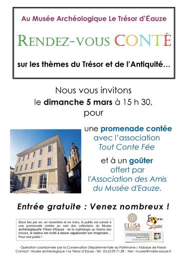 Accueil > Toutes les animations > Événements RDV Conté 05 Mars 2017 à 15h30 Le dimanche 5 mars est une date importante. C'est le premier RDV Conté de l'année 2017. 1h - Gratuit & Pour tout public. Laissez-vous conter les collections du Musée Archéologique / Le Trésor d'Eauze par l'association Tout Conte Fée. Un Goûter vous sera offert par l'Association des Amis du Musée d'Eauze.