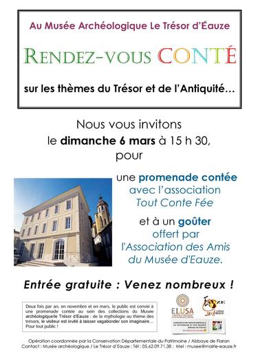 Accueil > Toutes les animations > Événements RDV Conté 06 Mars 2016 à 15h30 Le dimanche 6 mars est une date importante. C'est le premier RDV Conté de l'année 2016. 1h - Gratuit & Pour tout public. Laissez-vous conter les collections du Musée Archéologique / Le Trésor d'Eauze par l'association Tout Conte Fée. Un Goûter vous sera offert par l'Association des Amis du Musée d'Eauze.