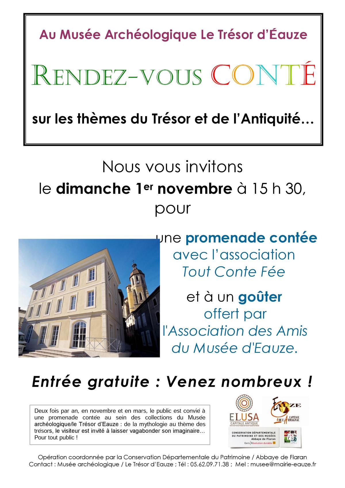 Accueil > Toutes les animations > Événements RDV Contés 01 Nov 2015 à 15h30 Le dimanche 1er novembre est une date importante. C'est le dernier RDV Conté de l'année 2015. 1h - Gratuit & Pour tout public. Laissez-vous conter les collections du Musée Archéologique / Le Trésor d'Eauze par l'association Tout Conte Fée. Un Goûter vous sera offert par l'Association des Amis du Musée d'Eauze.